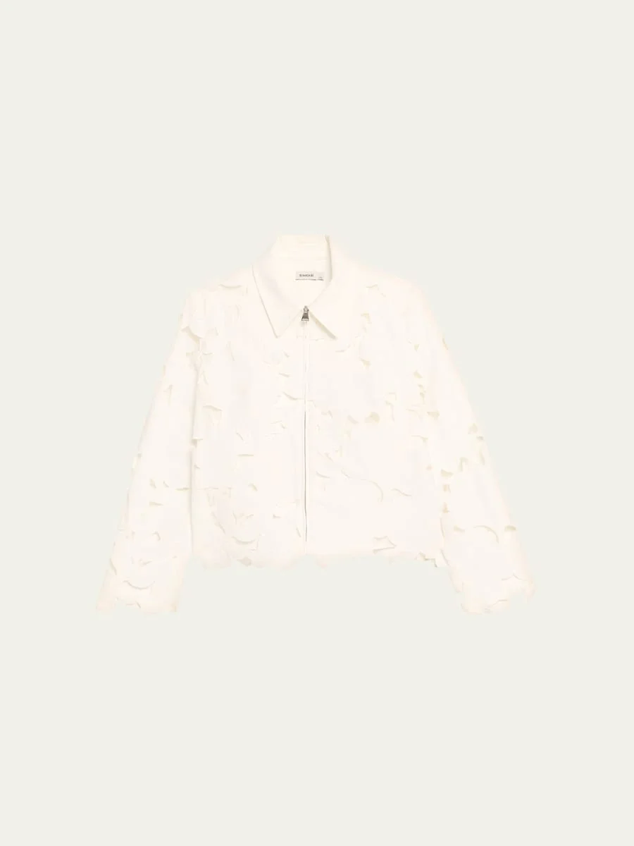 The "Quinn" jacket by SIMKHAI exudes style with intricate, floral embroidered cut-outs for a statement piece any wardrobe needs. Point collar Long sleeves Boxy fit Hem sits at the hip Zip-front Polyester Dry clean Imported Online Inquiries: BGS21_T6WYV| Store Inquiries: #5056763