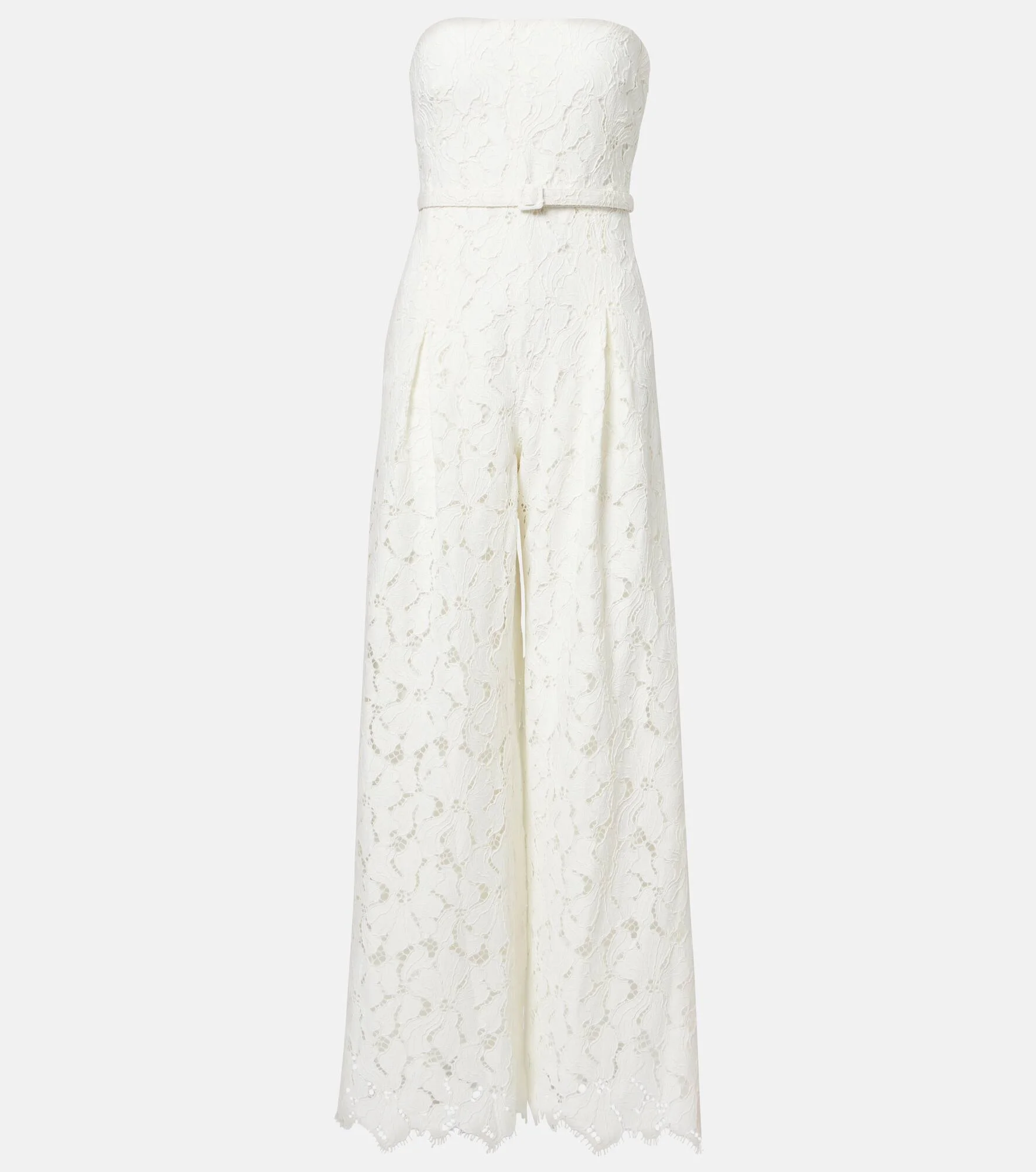 Taking inspiration from sculpture and architecture, Simkhai's impactful designs combine innovative construction with hand-detailing. Made from lace, the Rebecca jumpsuit is a belted piece with a chic strapless neckline. Product Details - Material: 100% polyester (recycled) - Care instructions: dry clean - Made in China - Designer color name: Ivory - Item color: white - Lining: 100% polyester - Lining II: 85% nylon, 15% elastane - Closure: zipped side - Hook-fastening built-in bustier - Boning - Pockets: side slit pockets - Detachable belt - Hem: scalloped - Item number: P01068675 Size & Fit - True to size - Strapless - Internal boned corset for support - Cinched waist - Non-stretchy fabric - Wide-leg - The model seen in the picture is 178cm-5'10" and wearing a size US 4