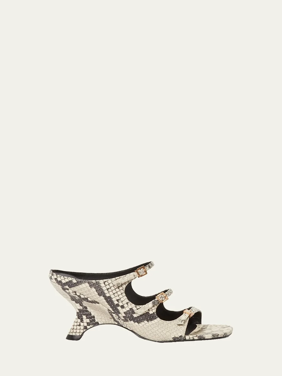 The "River" mules by SIMKHAI are crafted from snakeprinted calf leather 3.00 in / 75 mm architectural heel Squared open toe Three adjustable buckle straps Easy slide style Leather lining and outsole Wipe clean Imported