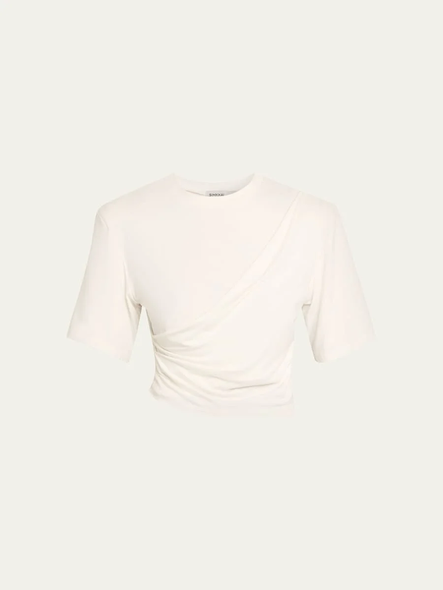 SIMKHAI "Rowley" soft jersey tee adorned with side gathers Crew neckline Short sleeves Cropped fit Pullover style Rayon/cellulose acetate/spandex Imported
