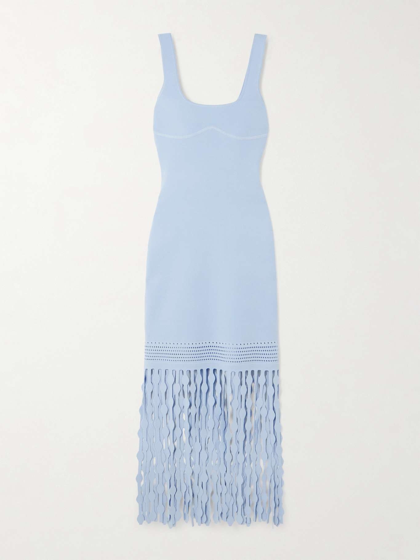 EDITORS'NOTES SIMKHAI's 'Signa' dress is destined for your next vacation. Made from flexible knit, it's traced with ribbing below the bust and fits slim before dropping to a serrated fringed skirt. Detailed with perforations at the knees, it's designed to sway gracefully in the breeze. SIZE & FIT Model measurements: - Fits true to size, take your normal size - Intended for a slim fit - Mid-weight knit - Model is 175cm/ 5'9" and is wearing a size XSmall - Bust: 81cm/ 32" - Waist: 64cm/ 25" - Hip: 89cm/ 35" DETAILS & CARE - Light-blue rayon-blend - Slips on - 65% rayon, 19% nylon, 14% polyester, 2% elastane - Dry clean - Designer color: French Blue