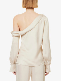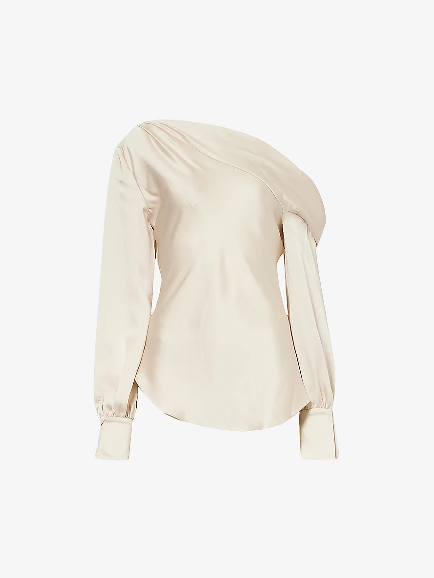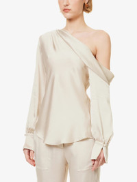 PRODUCT DETAILS - Simkhai satin top - 89% acetate, 11% polyester - Slips on - Regular fit, asymmetric neckline, exposed shoulder, long sleeves, buttoned sleeve hems, draped design, curved hem - Dry clean - True to size - Size small: length 24in / 61cm - Model is 5ft 10in/1.78m and wears a size small - Lightweight, non-stretch Ref: R04248685