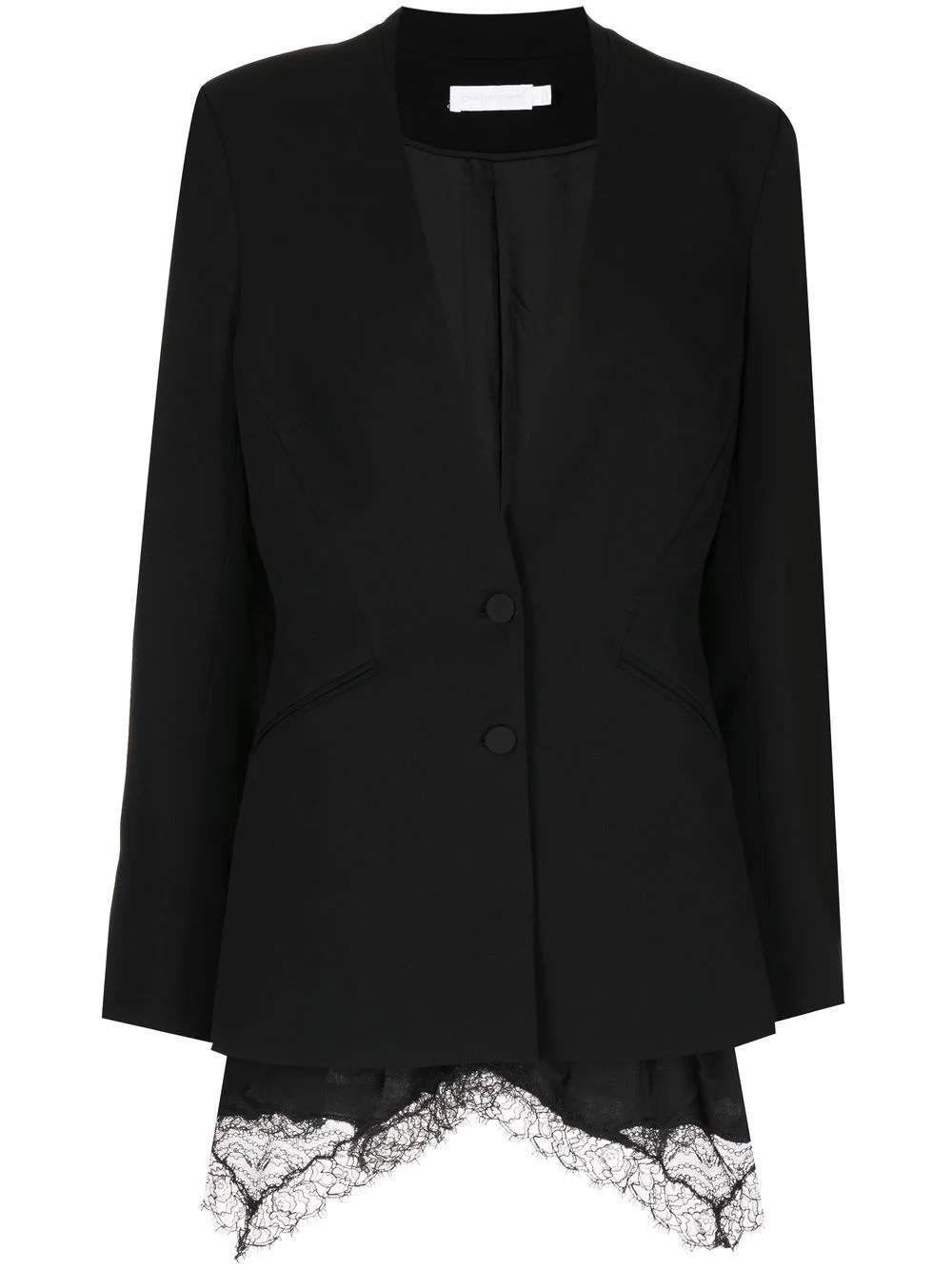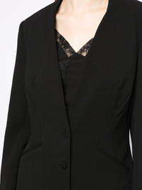 collarless single-breasted jacket black collarless front button fastening two front welt pockets long sleeves Made in United States Composition Acetate 71%, Polyester 29% SIZE & FIT Model measurements Height 5 ft 11 in(1.8 m) Bust/Chest 28.34 in(72 cm) Hips 35.43 in(90 cm) Waist 23.62 in(60 cm) FittingInformation This piece fits true to size. We recommend you get your regular size Designed for a loose fit with a close fit at the waist Made with a mid-weight non-stretch fabric Washing instructions Dry Clean Only