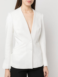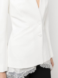 lace-hem collarless blazer optical white cady texture slim cut lace trim no lapels front button fastening two front welt pockets buttoned-cuff sleeves Imported Composition Outer: Acetate 71%, Polyester 29% Lining: Polyester 100% SIZE & FIT Model measurements Height 5 ft 11 in(1.8 m) Bust/Chest 31.49 in(80 cm) Hips 36.22 in(92 cm) Waist 25.59 in(65 cm)