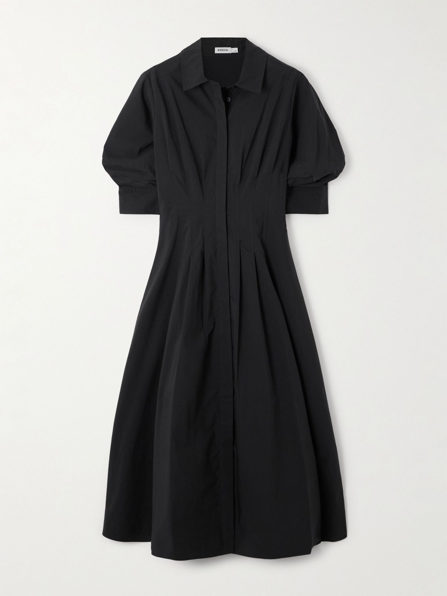 SIMKHAI updates the classic shirt dress with a darted, nipped-in waist that creates pleats through the full skirt. This 'Jazz' style is made from cotton-blend poplin and has voluminous short sleeves and a smart collar. Wear it with strappy sandals or sneakers. Size & Fit - Fits true to size, take your normal size - Designed for a slightly loose fit - Mid-weight, non-stretchy fabric - Model is 180cm/ 5'11" and is wearing a size Small Model measurements: - Bust: 86cm/ 34" - Waist: 65cm/ 25.5" - Hip: 90cm/ 35.5" Details & Care - Black cotton-blend poplin - Partially concealed button fastenings through front - 63% cotton, 37% polyester; lining: 82% rayon, 18% nylon - Machine wash