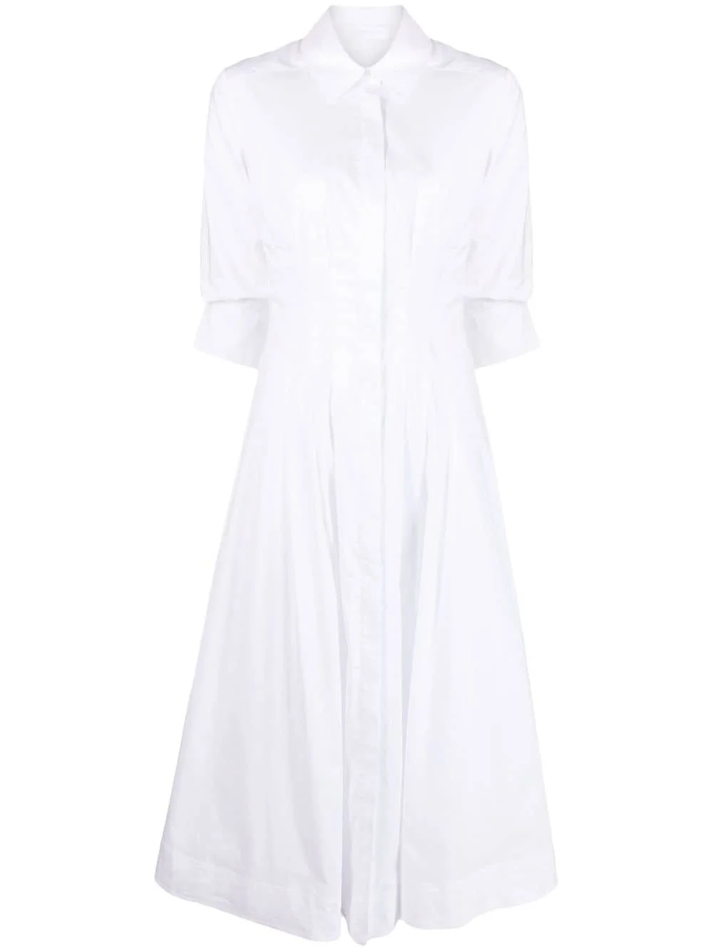 Jazz pintuck midi dress Highlights - White - Cotton blend - Classic collar - Concealed front button fastening - Half-length sleeves - Buttoned cuffs - Fitted waistline - Flared skirt - Mid-length Imported Composition Outer: Cotton 60%, Polyester 40% Lining: Rayon 82%, Nylon 18% SIZE & FIT Model measurements Height 5 ft 10 in(1.77 m) Bust/Chest 32.28 in(82 cm) Hips 35.03 in(89 cm) Waist 25.19 in(64 cm) FittingInformation Designed for a close fit at the chest and waist with a loose fit at the hip Made from a midweight non-stretch fabric This piece fits true to size – take your usual size Washing instructions Dry Clean Only