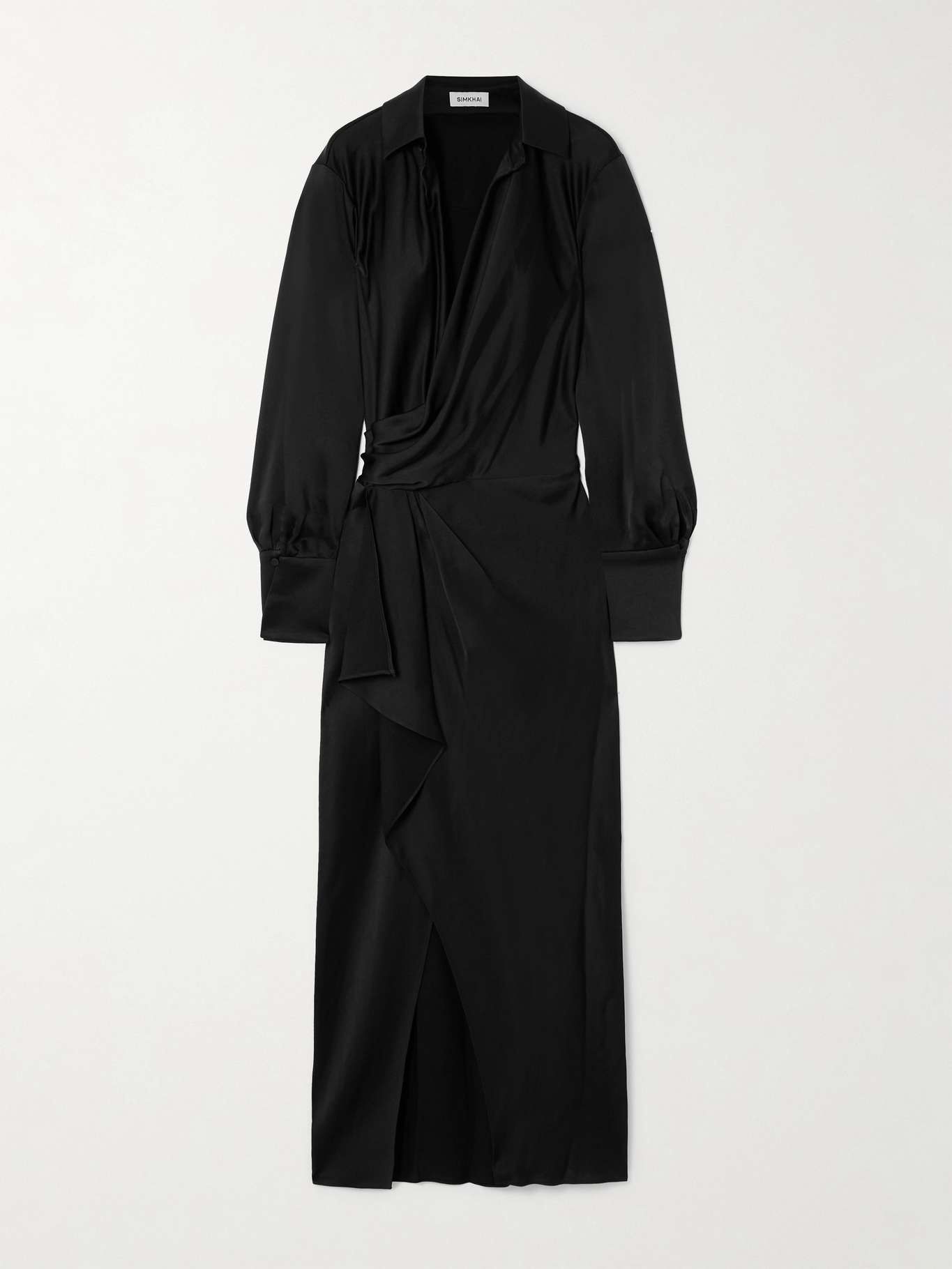 EDITORS'NOTES Simkhai's 'Talita' dress is beautifully draped and gathered at the front, giving it an elegant, wrap-effect. It's cut from fluid satin and has a plunging V-neckline and blouson sleeves. Wear it to your next event with point-toe pumps and silver jewelry. SIZE & FIT Model measurements: - Fits true to size, however those who are between sizes should take the smaller size - Designed for a relaxed fit - Mid-weight, non-stretchy fabric - Model is 177cm/ 5'10" and is wearing a US 2 - Bust: 81cm/ 32” - Waist: 67cm/ 26.5” - Hip: 91cm/ 36” DETAILS & CARE - Black satin - Concealed zip fastening along side - 89% acetate, 11% polyester; lining: 100% polyester - Dry clean