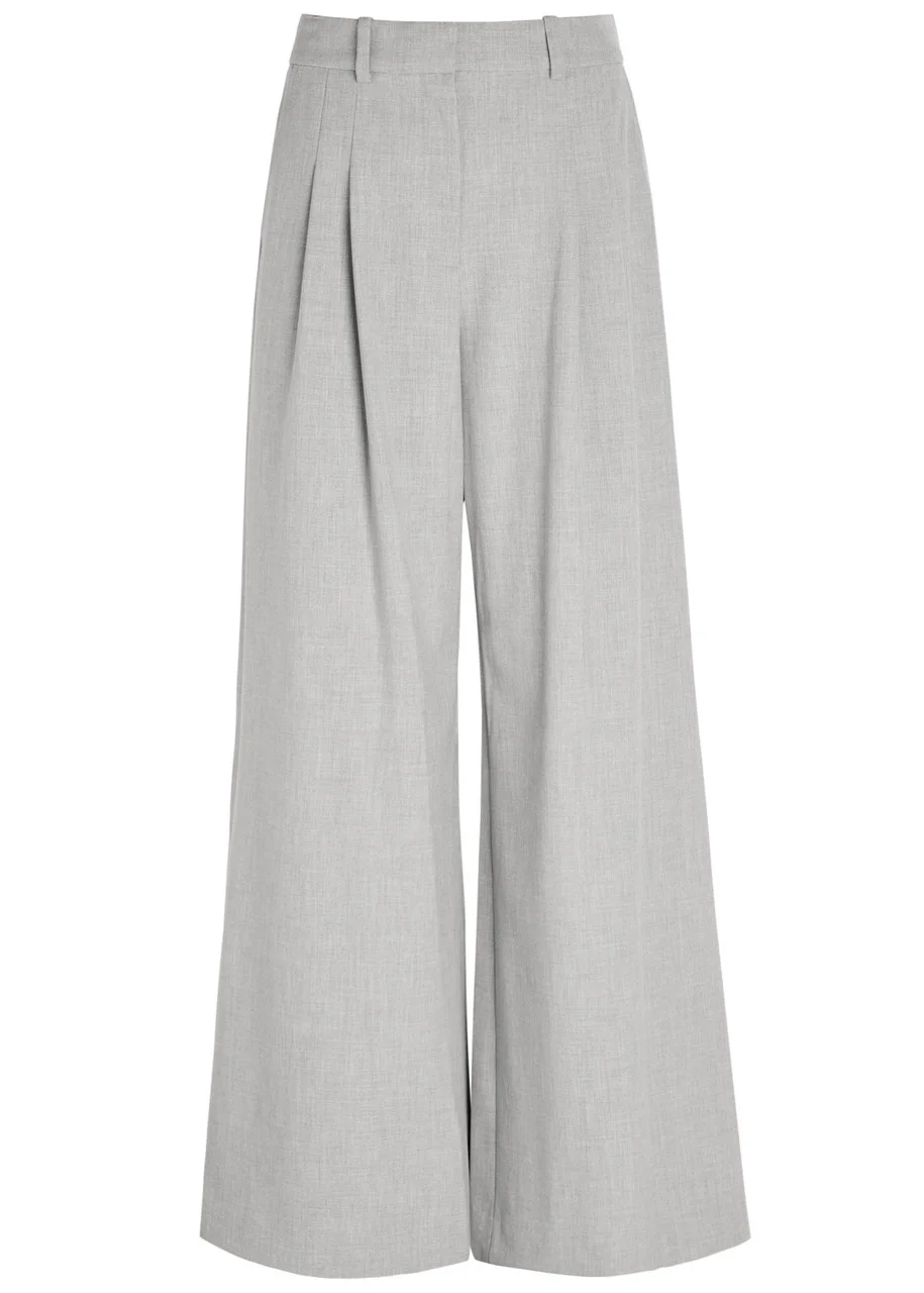 Info & Care Jonathan Simkhai woven trousers Melange, belt loops, side slip pockets, pleats at waist, back slit pockets Concealed hook, button and zip fastening at front; 67% polyester, 29% viscose, 4% elastane Machine wash Size & Fit Inside leg length: 33 inches/ 84cm Midweight Wide-leg cut, high-rise fit Tailored style Model is 5'9"/ 175cm and wears a size;US4