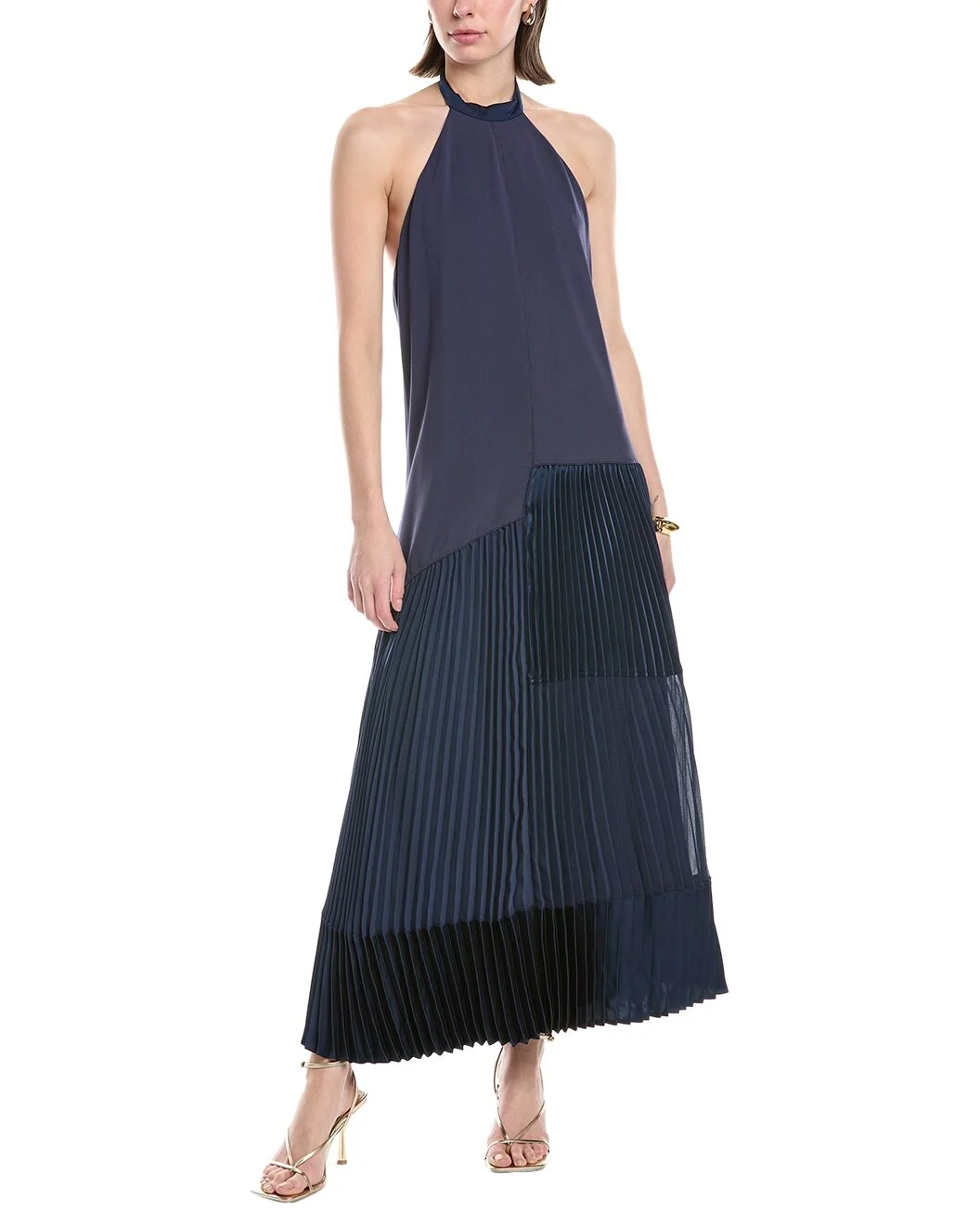 - Color/pattern: midnight - Approximately 59in from shoulder to hem - Model is 5'9 and is wearing a size 0. Measurements may vary slightly by size. - Design details: self-tie halter neck, open back and pleated asymmetrical skirt - Center back zipper with hook-and-eye closure - 71% acetate, 29% polyester - Combo & Lining: 100% polyester - Hand wash - Imported