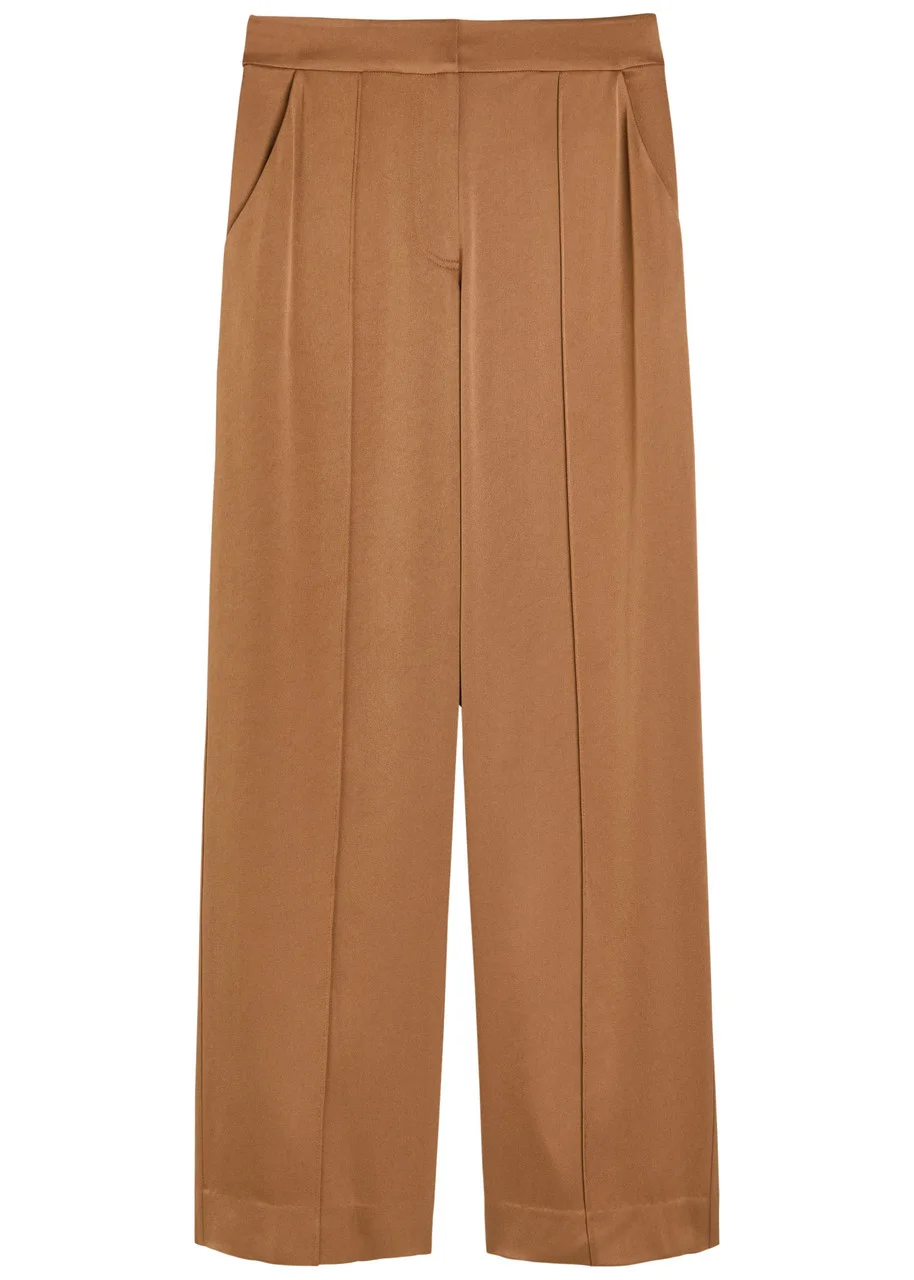 Info & Care Simkhai satin trousers Belt loops, pintuck through legs, side slant pockets, back slit pockets Partially concealed zip, hook and button fastening at front 84% acetate, 16% polyester Dry clean Coordinating items available Size & Fit Inside leg length: 33 inches/ 84cm Midweight Wide-leg cut, high-rise fit; Tailored style Model is 5'9"/ 175cm and wears a size US4