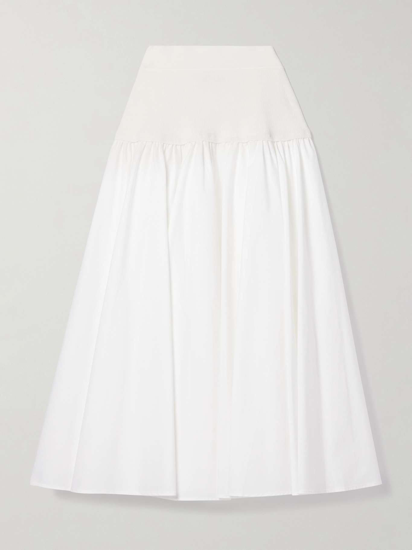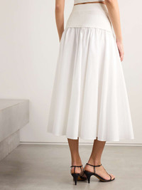 EDITORS'NOTES SIMKHAI's 'Stella' skirt is cut from cotton-blend poplin and pleated to create a voluminous A-line shape. It's also fitted with a ribbed-knit panel that comfortably hugs your waist. Pair yours with the coordinating cropped top, as the brand intended. SIZE & FIT Model measurements: - Fits true to size, take your normal size - Midi-length, designed to be worn at the waist - Elasticated at the waist for a flexible fit - Lightweight, non-stretchy fabric - Model is 180cm/ 5’11” and is wearing a size XSmall - Bust: 81cm/ 32” - Waist: 62cm/ 24.5” - Hip: 88cm/ 34.5” DETAILS & CARE - White cotton-blend poplin and ribbed-knit - Slips on - Fabric1: 63% cotton, 37% polyester; fabric2: 83% viscose, 17% elastane; lining: 100% cotton - Dry clean