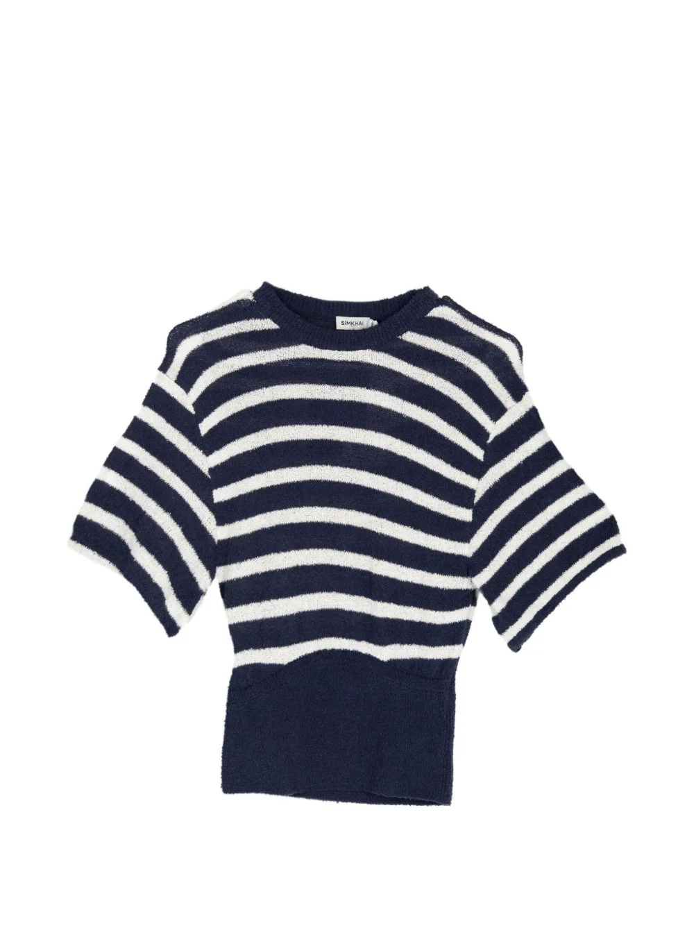 striped knit sweater Highlights - Blue/white - Stripe pattern - Short sleeves - Crew neck - Knit finish Imported Composition Fabric 100% Washing instructions Read Manufacturer Guidelines