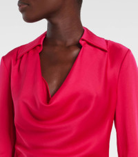 Inspired by sculpture and architecture, Simkhai's designs combine innovative construction with hand-detailing. Made from lustrous satin, the Symone top is complete with a pointed collar, a cowl neckline, and elegant draped detailing. Product Details - Material: 84% acetate, 16% polyester - Care instructions: dry clean - Made in China - Designer color name: Fuchsia - Item color: pink - Closure: concealed zipped side - Collar: cowl neck - Cuff: one button - Hem: uneven - Item number: P01113726 Size & Fit - True to size - Cinched waist - Non-stretchy fabric - Falls to the hip - The model seen in the picture is 178cm-5'10" and wearing a size US 4