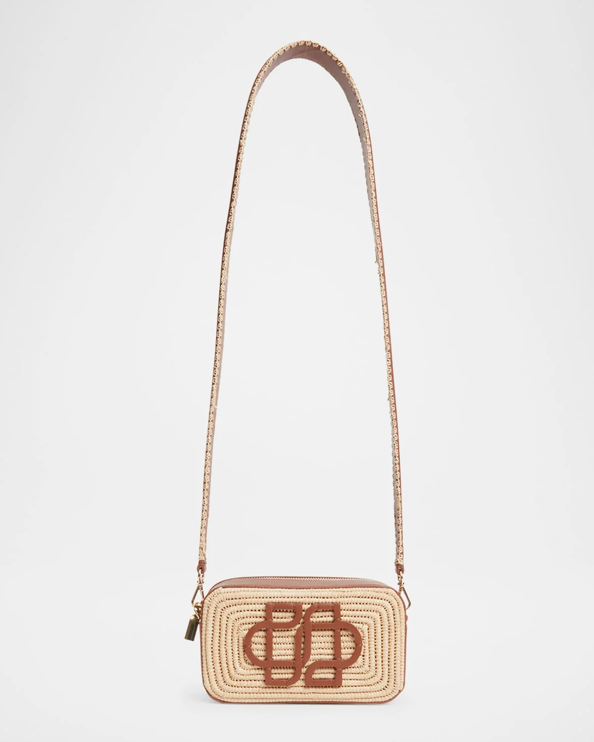 - SIMKHAI "Talia" camera bag in raffia, detailed with leather trim and embroidery - Detachable crossbody strap - Can be worn as a clutch or crossbody bag - Zip top closure - Lining: Cotton - Approx. 4.4"H x 7.7"W x 2.8"D - Imported