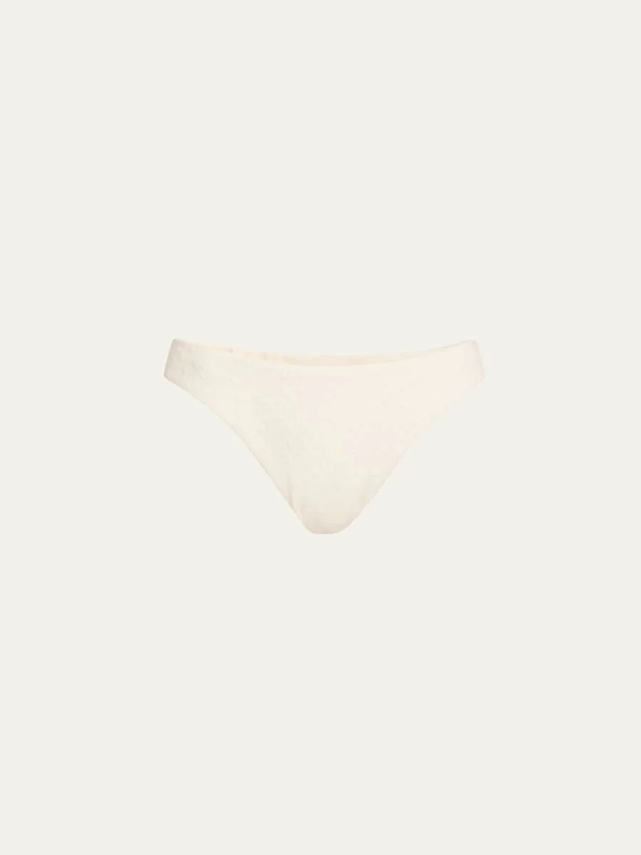 The "Tati" bikini bottoms by SIMKHAI are crafted from a textured jacquard fabric Low-rise hipster style Cheeky seat coverage Polyester/spandex/nylon/polyamide Imported Top sold separately Online Inquiries: BGS21_T6RUW| Store Inquiries: #5027520