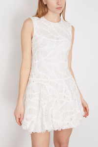 The Simkhai Vallan Sleeveless Mini Dress is perfect for a spring party or wedding. This mini dress features a fitted bodice with a drop waistline in delicate textured lace. Wear yours with heels and a clutch. - Fits true to size, take your normal size - Mini length - Fitted bodice - Drop waistline - Ruffled hemline - Lace material - 70% POLYESTER 30% NYLON, LINING: 100% POLYESTER