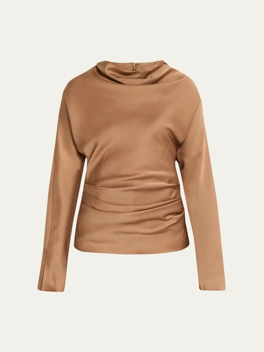 SIMKHAI "Victoria" luxe satin blouse adorned with elegant draping Cowl neckline Long sleeves with vented cuffs Slim fit Hem sits at the hip Center back zip Acetate/polyester Dry clean Imported