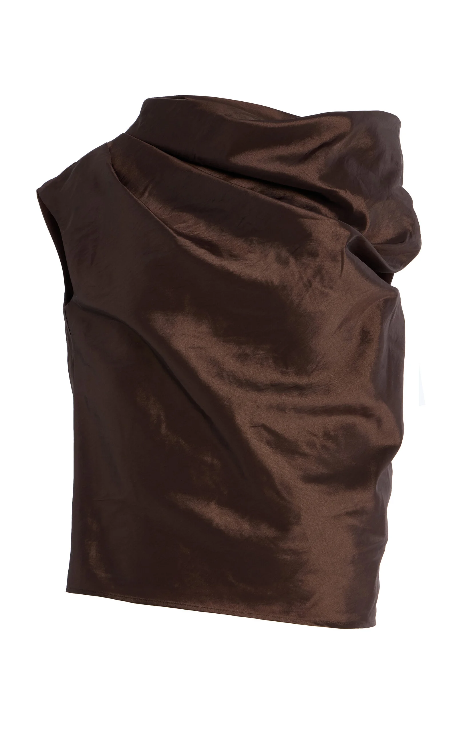 PRODUCT DETAILS - Slim fit, high neckline, cap sleeves, draped detailing throughout - Pull Over - Fully Lined - Composition: Shell: 70% Polyester 30% Nylon, Lining: 100% Polyurethane - Color: brown - Dry Clean Only - Fall-Winter '25