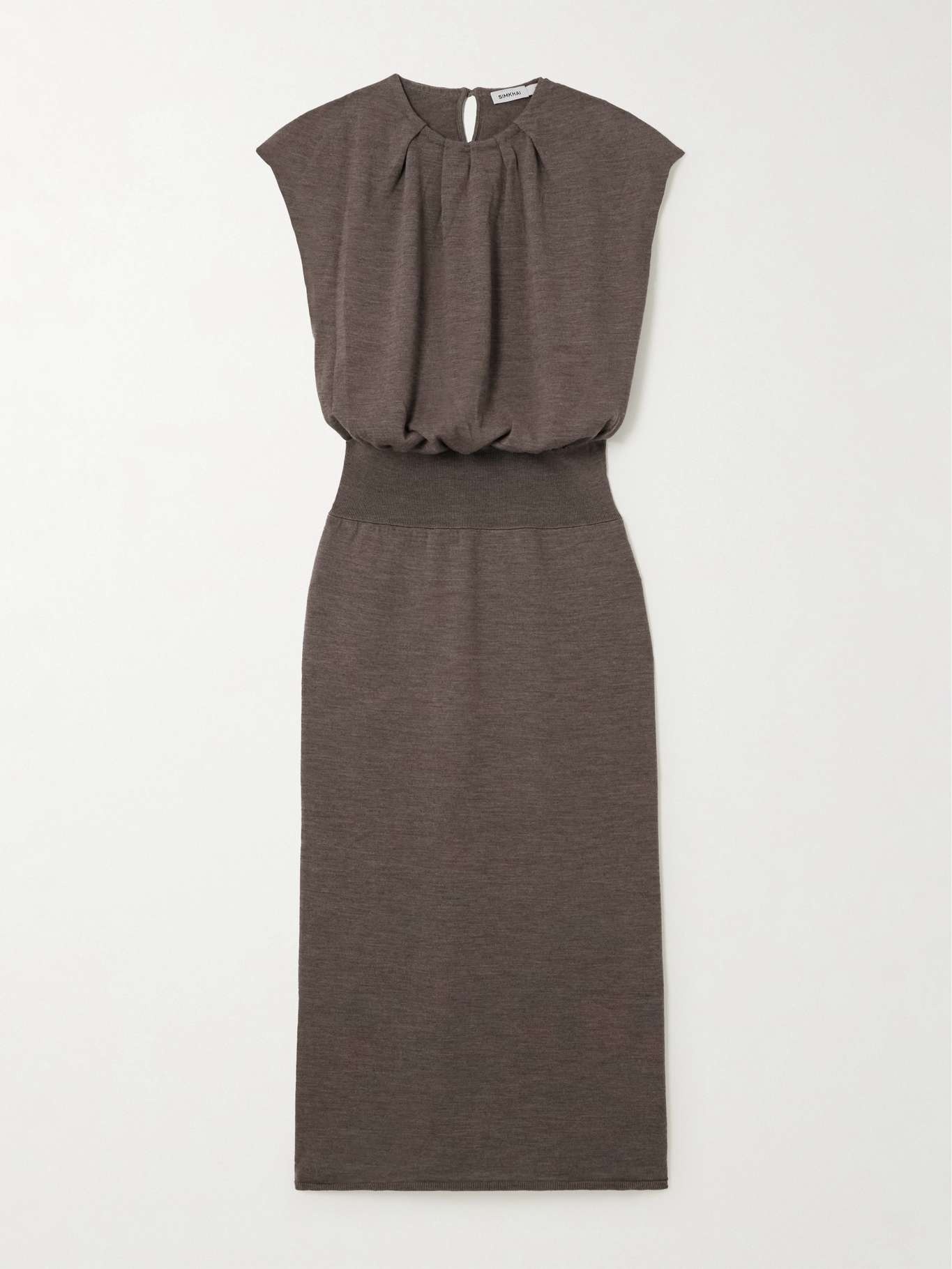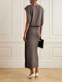 EDITORS'NOTES At first glance, Simkhai's 'Xion' dress looks like two perfectly coordinated separates styled together. It's made from wool and has a gathered crew neck and paneled waist. Wear yours with knee boots and a leather jacket. SIZE & FIT Model measurements: - Fits true to size, take your normal size - Intended to be fitted at the hip with a loosely cut top - Fine knit - Model is 180cm/ 5'11" and is wearing a size Small - Bust: 85cm/ 33.5" - Waist: 62cm/ 24.5" - Hip: 88cm/ 34.5" DETAILS & CARE - Brown merino wool - Button-fastening keyhole at back - 100% merino wool - Dry clean