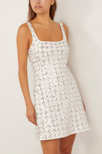 The Simkhai Ziva Sleeveless Embellished Mini Dress will have you ready for a party. This mini dress features playful sparkling embellishments in a shift silhouette. Wear yours with heels and a clutch. FIT DESCRIPTION MODEL MEASUREMENTS - Fits true to size, take your normal size - Mini length - Shift silhouette - Square necline - Embellishments - Concealed zipper - 97% Polyester 3% Lycra - Emma is wearing a size 2 - Bust: 32” - Waist: 25” - Hips: 34” - Height: 5’7”