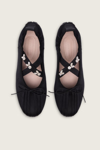 The Ballerina Grip feature a flexible traction sole for superior comfort. The new design is elevated by criss-cross straps adorned with sparkling crystals. Product Details Sporty satin ballerina pump - Seasonal crystal embellishment - Elastic criss-cross strap - Bow ribbon detail - Rubber trek sole Composition: Upper: 100% Leather Lining: 100% Leather Sole: 100% Ethylene-Vinyl Acetate SKU: BPT1B 0755 BLACK/CLEAR