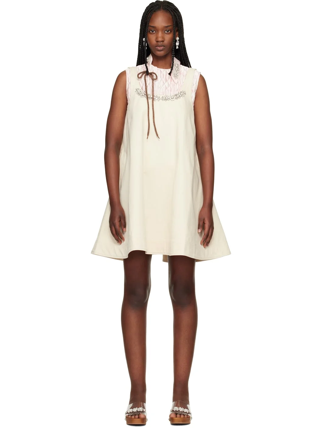 Cotton twill minidress. · Faux-pearl and prong-set crystals at square neck · Flared hem · Seam pocket at side seams · Fixed shoulder straps · Zip closure at back · Leather logo patch with prong-set crystals at back · Unlined Supplier color: Ecru/Pearl/Clear 100% cotton. Made in Portugal 261405F052002
