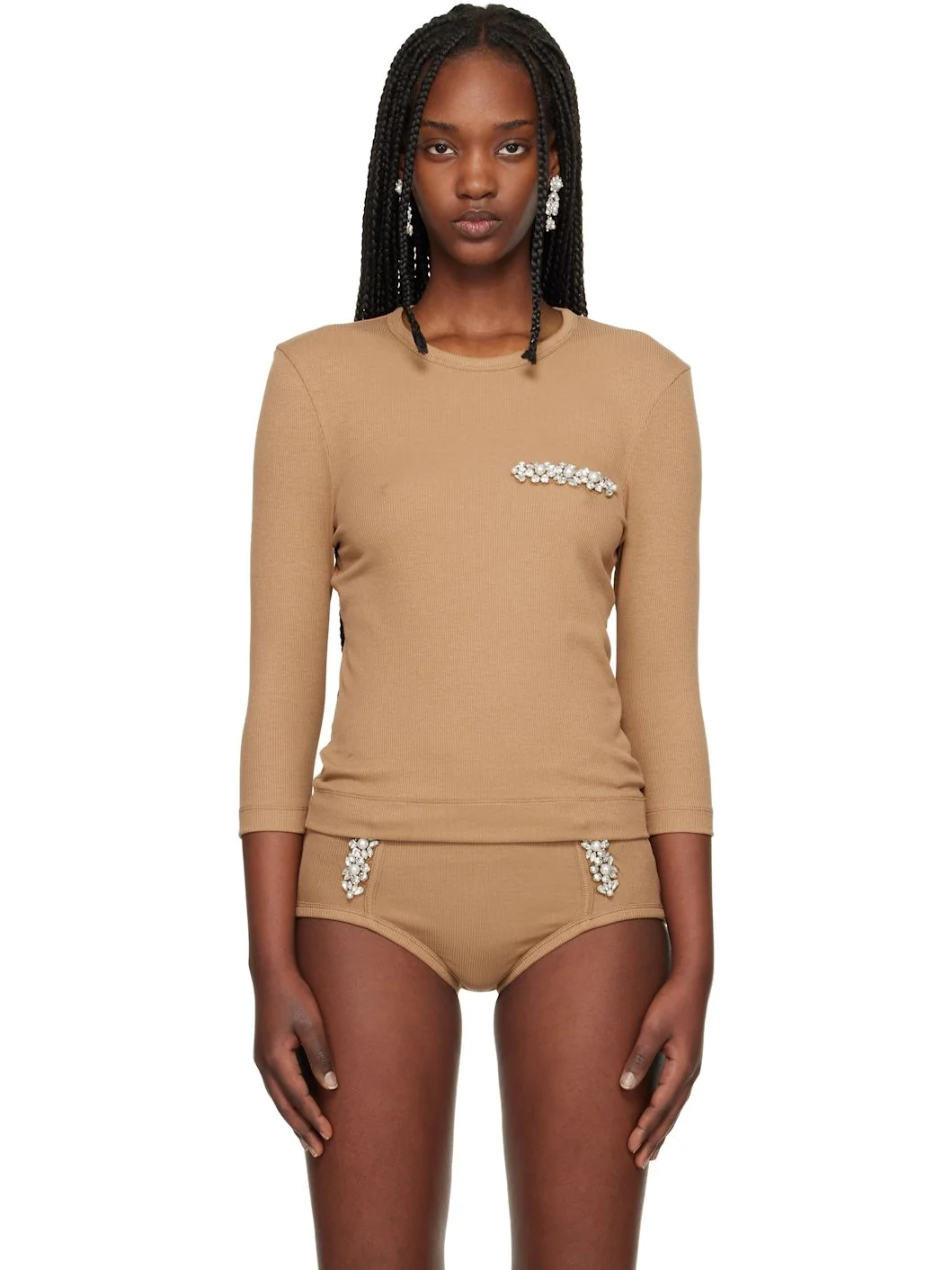 Rib-knit stretch lyocell-blend T-shirt. · Crewneck · Faux-pearls and prong-set crystals at chest · Three-quarter sleeves · Logo embroidered at back collar Supplier color: Toffee/Pearl/Clear 63.5% lyocell, 31.5% cotton, 5% elastane. Made in Portugal 261405F110003
