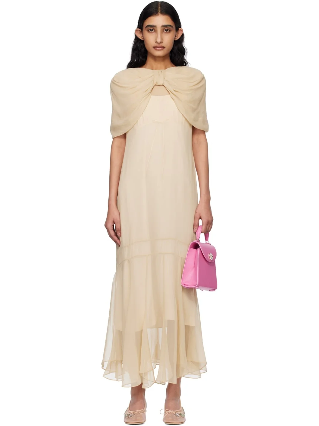 Sheer silk georgette maxi dress. Draped cape-style overlay at shoulders. · Round neck · Handkerchief hem · Concealed zip closure at back · Unlined Supplier color: Biscuit 100% silk. Made in Portugal 251405F054007