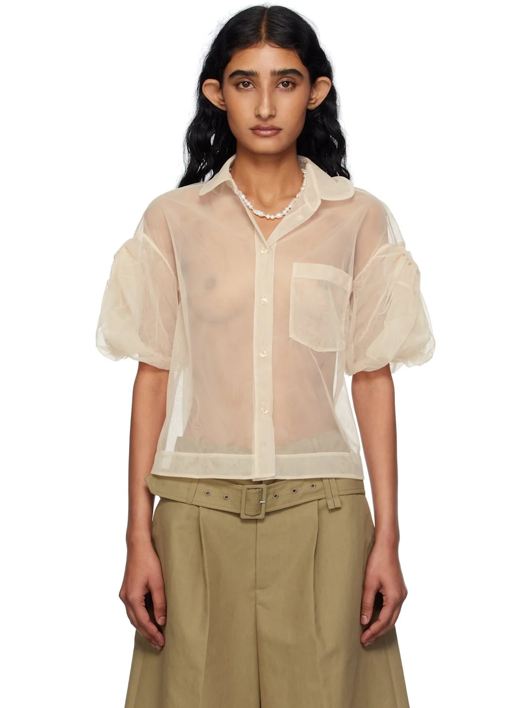 Beige Sheer Cropped Bow Puff Sleeve Shirt