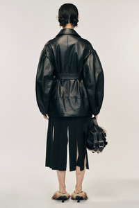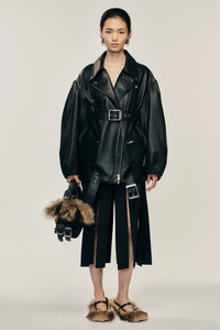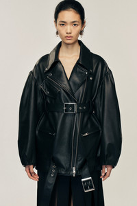 An oversized biker style leather jacket features Simone Rocha's signature puff sleeve for an updated take on a classic shape. Its integrated belt details and asymmetrical zips are found for some alternative styling options. The model is wearing this style with the Multi Slit Skirt & Long Graphic Logo Knit Scarf. Product Details Structured leather biker jacket - From Look 16 on the runway - Double belt buckle detail - Signature puff sleeve - Flap and zip pockets - Oversized fit Composition: 100% Cow Leather Lining: 100% Viscose SKU: 6128 0457 BLACK Size & Fit Model is wearing size 10.