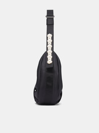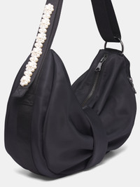 This nylon shoulder bag combines utilitarian elements with distinctive detailing. The design is defined by a large, gathered bow on the front and back. Featuring: • Gathered bow detail • Multi-zip pockets • Adjustable strap with signature pearl beading • Fully lined • Made in China • Outer: 100% Polyester | Lining: 100% Polyester | Trim: 100% Polyester • One size