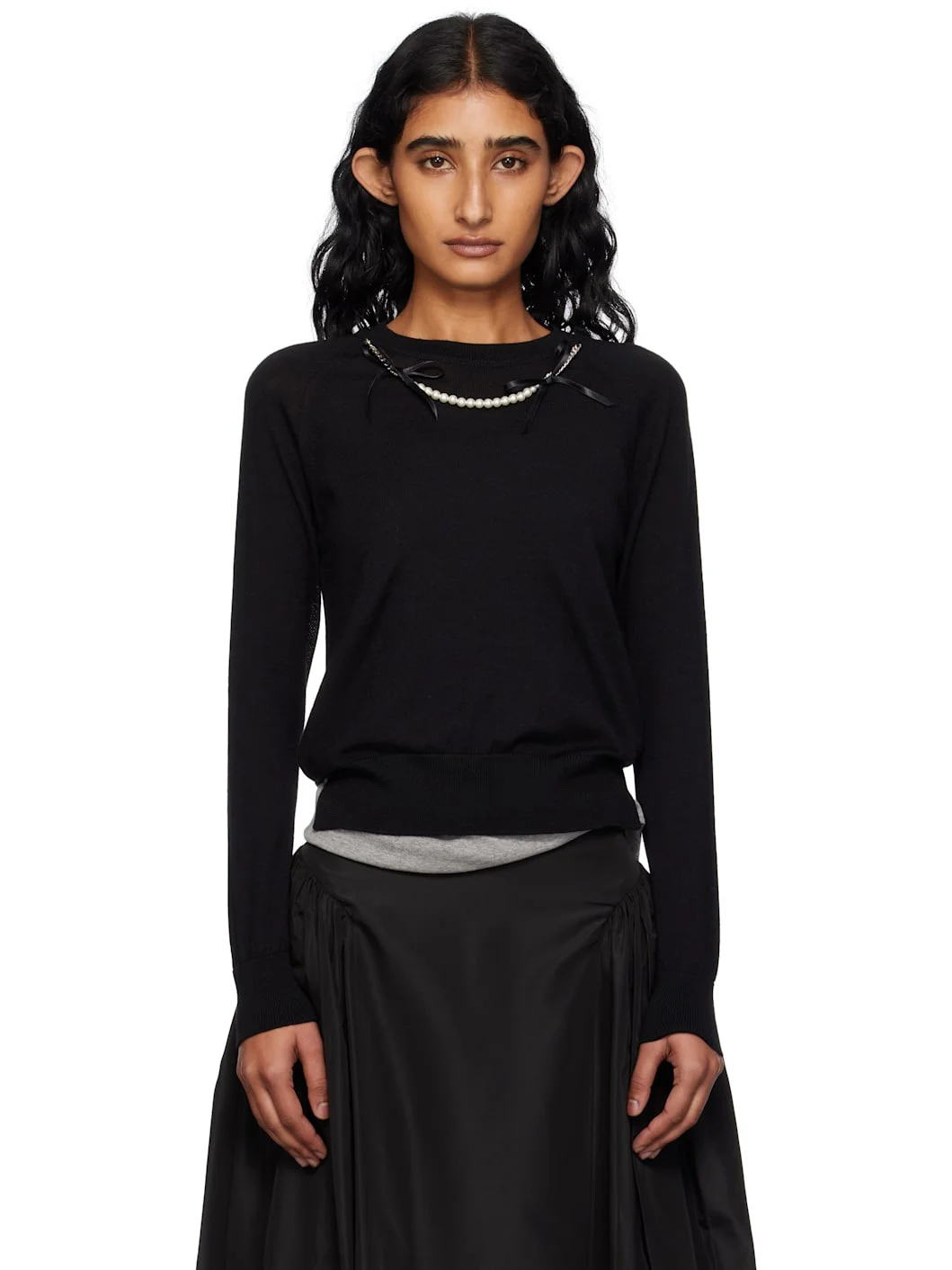 Knit merino wool- and silk-blend sweater. · Rib-knit crewneck, hem, and cuffs · Beaded pearl strap with bow accents at front · Vented side seams Supplier color: Black/Pearl 75% merino wool, 25% silk. Made in Portugal 252405F096002