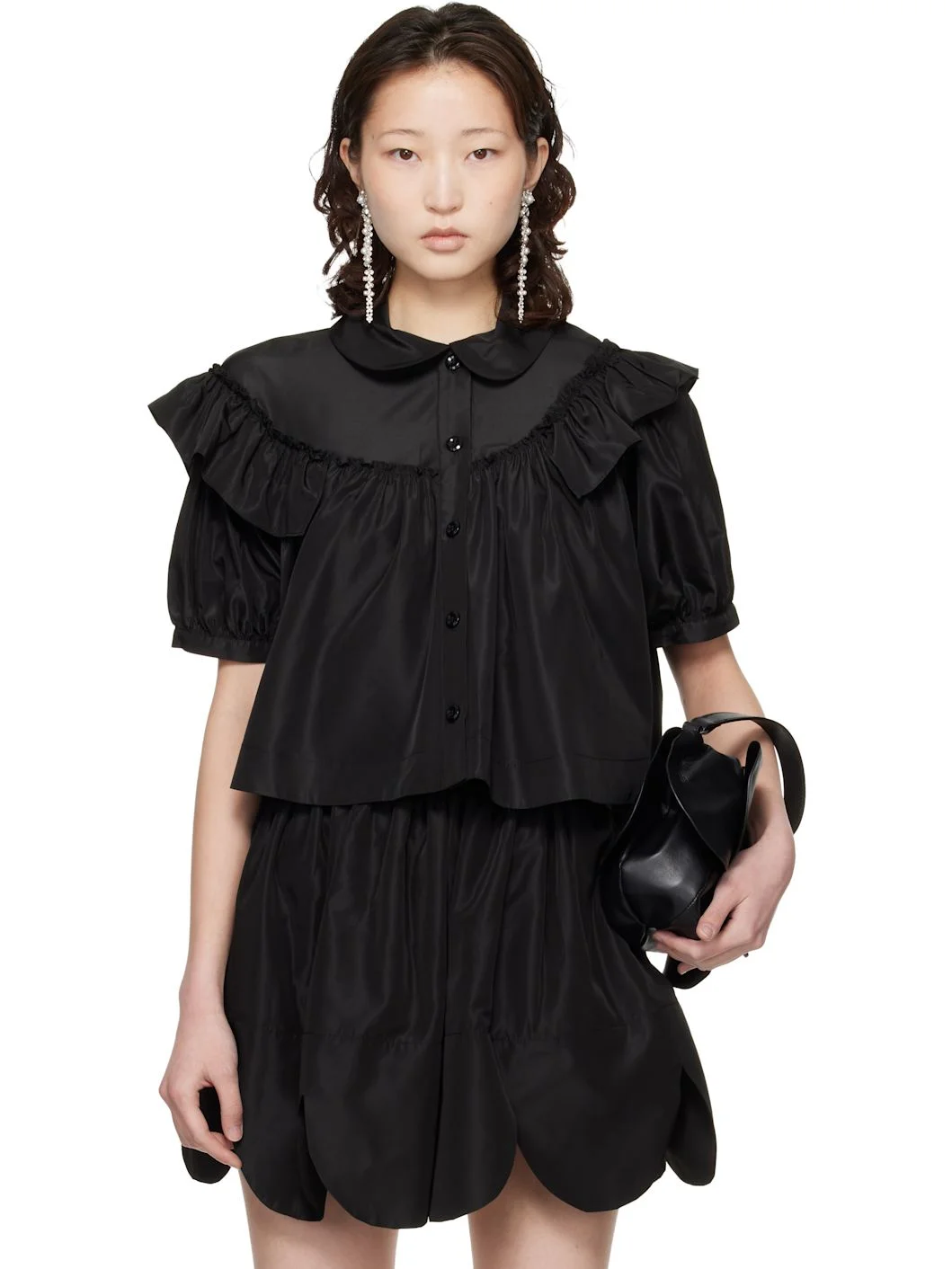 Taffeta shirt. · Ruffled trim throughout · Peter Pan collar · Button closure · Cropped hem · Puff sleeves Supplier color: Black 71% acetate, 29% polyester. Made in Portugal 261405F109004