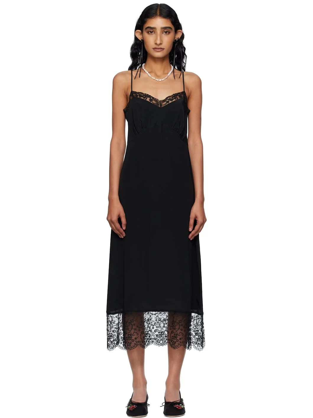 Crepe de chine midi dress. · Lace trim at sweetheart neck and hem · Gathering at cups · Adjustable spaghetti straps Supplier color: Black Body: 73% acetate, 27% silk. Trim 1: 100% polyamide. Trim 2: 100% viscose. Made in Portugal 252405F054015
