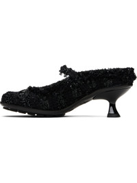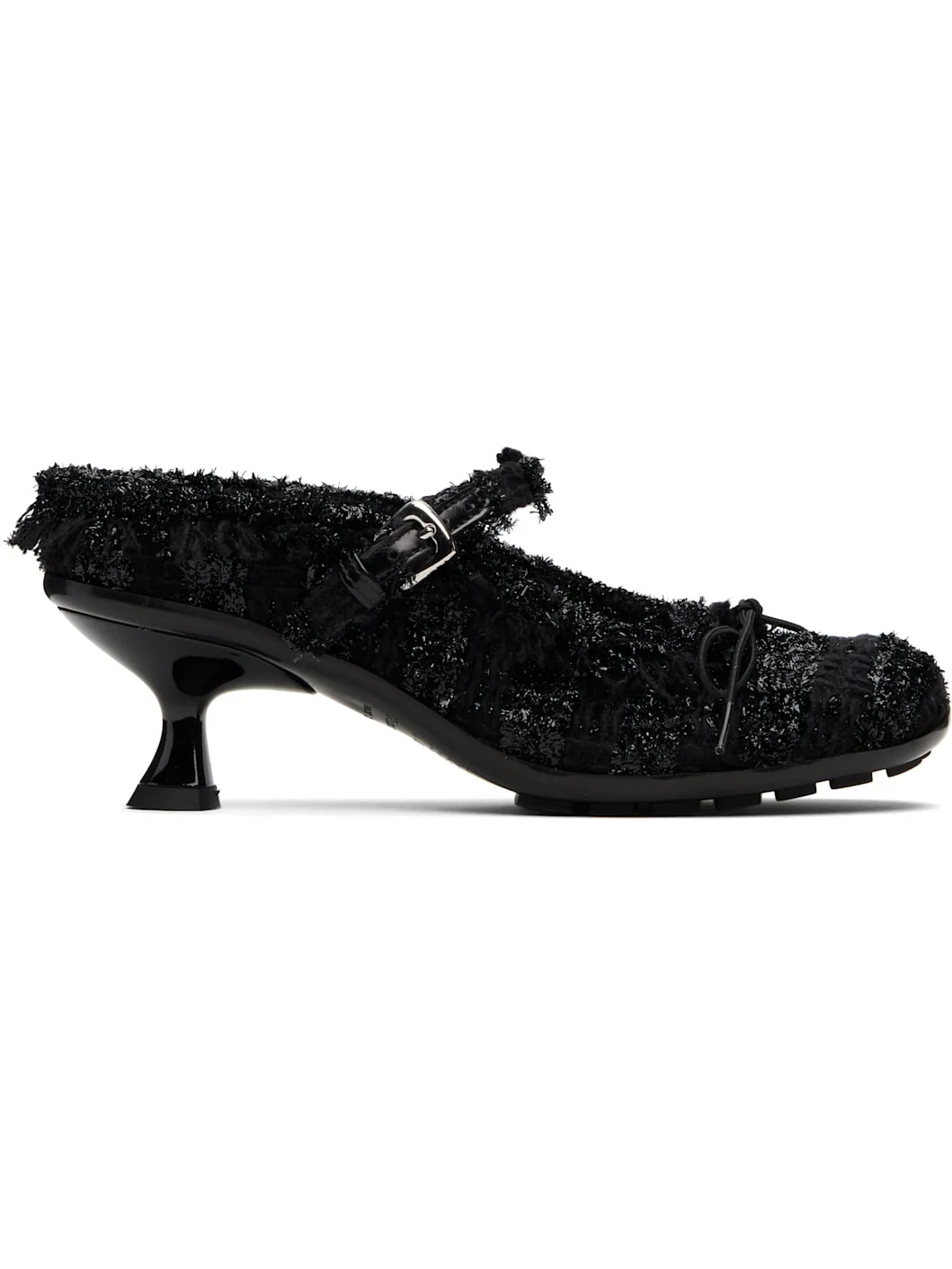 Tweed heels. · Metallic thread detailing throughout · Elasticized bow accent at vamp · Pin-buckle strap · Logo stamp at padded leather footbed · Leather lining · Rubber spool heel · Treaded rubber sole · Heel: H2" Supplier color: Black Upper: textile. Sole: rubber. Made in Portugal 252405F122004
