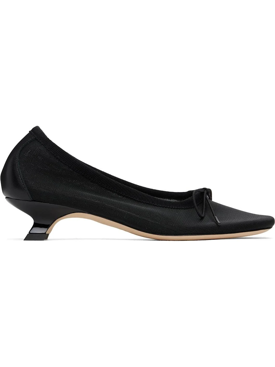 Semi-sheer mesh heels in black. · Square toe · Bow at vamp · Elasticized grosgrain collar · Grained leather trim at heel counter · Padded leather footbed · Patent kitten heel · Suede sole with rubber injection · Heel: H1.5" Supplier color: Black Upper: textile, leather. Sole: leather. Made in Portugal 251405F122004