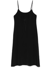 bow slip midi dress Highlights - Black - Adjustable spaghetti straps - Gathered detailing - Scallop edge Imported Composition Polyester 100%, Acetate 73%, Silk 27% SIZE & FIT Model measurements Height 5 ft 10 in(1.78 m) Bust/Chest 33.46 in(85 cm) Hips 35.43 in(90 cm) Waist 23.22 in(59 cm) FittingInformation Designed for a slim fit that sits just away from the body offering a close yet comfortable fit The adjustable shoulder straps allow for a preferred fit when worn Made from a lightweight non-stretch fabric