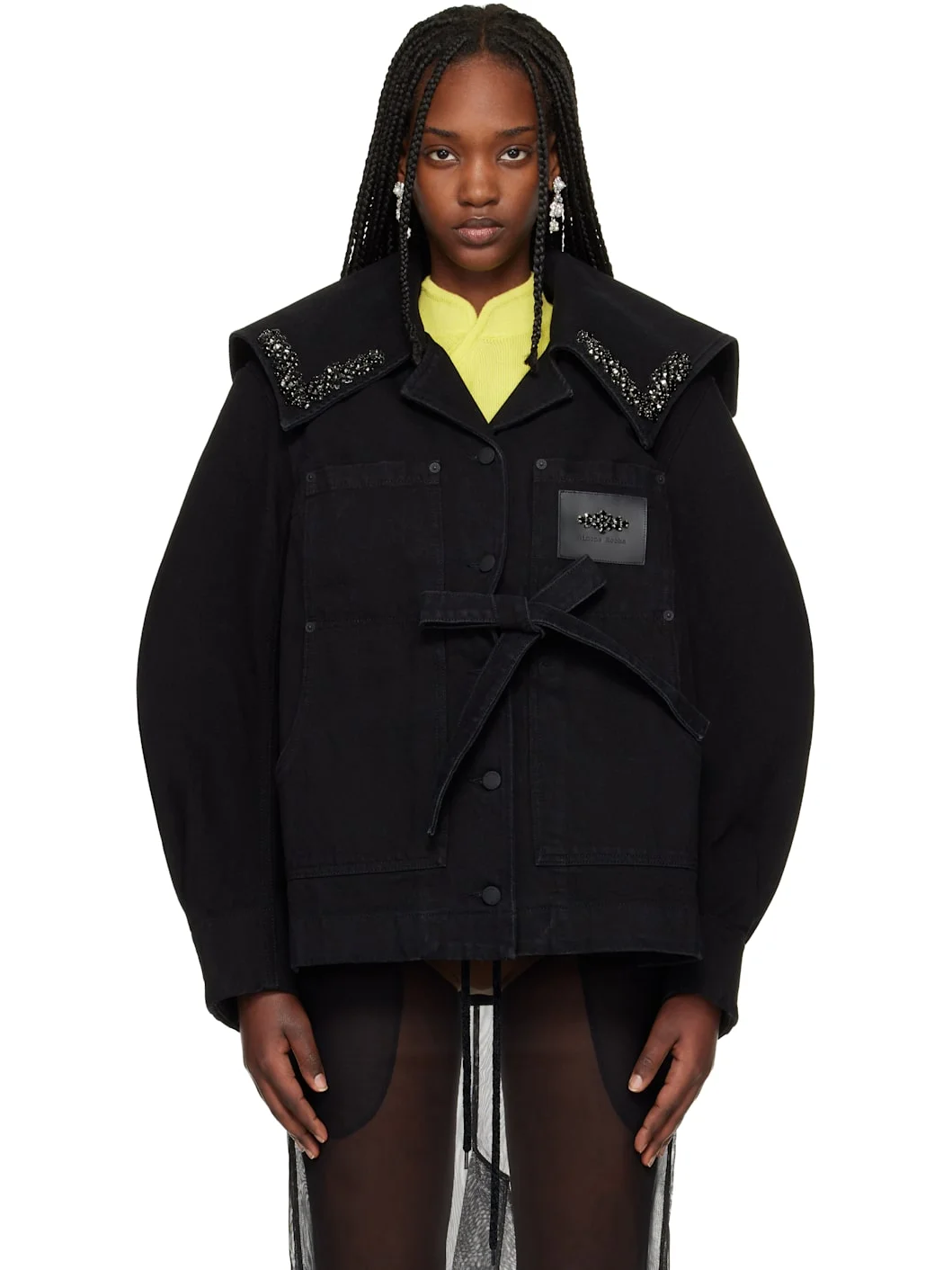 Non-stretch denim jacket. · Fading throughout · Prong-set crystals at sailor collar · Button closure · Patch pocket at chest · Unlined Supplier color: Black/Jet 100% cotton. Made in Portugal 261405F063007