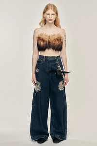 The wide leg jeans receive an update with a wash for a more worn feel, embellishments are featured by the distressed rips at the front legs. The model is wearing this style with the Faux Fur Bandeau. Product Details Distressed cotton denim wide leg jeans - Signature embellishment - Beaded label at back - Four pocket styling - High-waist fit Composition: 100% Cotton (Excluding Embellishment) SKU: 4165B 1231D DISTRESSED BLUE/PEARL/CLEAR Size & Fit Model is wearing size 6.