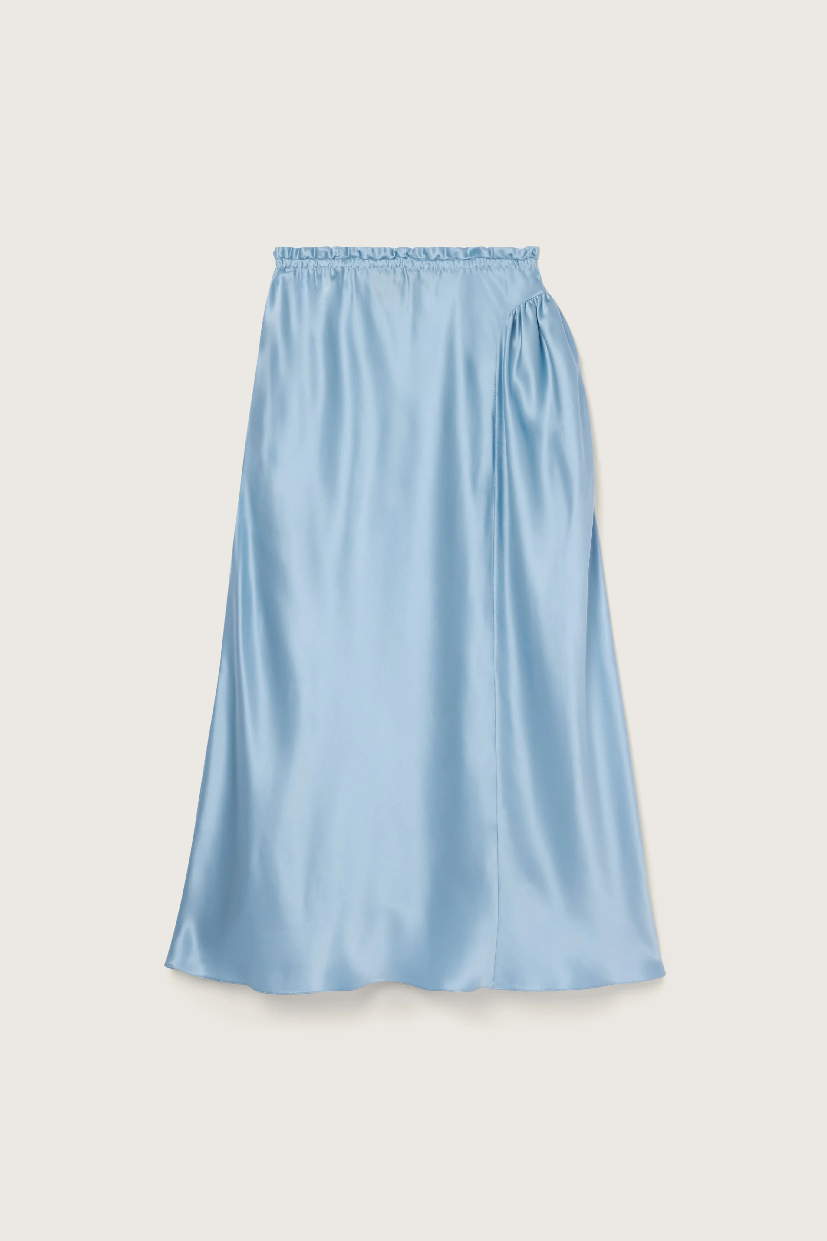 An easy silky elasticated waist skirt with a asymmetrical hip detail at one side, a nod to a subtle historical reference to hip pads. Product Details Silk satin maxi skirt - Elasticated waist - Asymmetrical hip detail - Pockets at side - Mid-waist fit Composition: 100% Silk SKU: 3172 1251 BABY BLUE