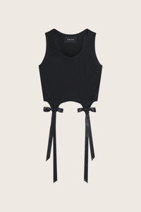 Simone Rocha cropped tank top in a soft fine jersey fabrication. Designed for a more fitted silhouette, featuring long satin bow tails at the front. Product Details Fine jersey tank top - Satin bow tail accents - Scoop neck and gathered darts - Cropped hem Composition: Self: 100% Cotton Trim: 100% Polyester Ribbon SKU: 5222 0571 BLACK