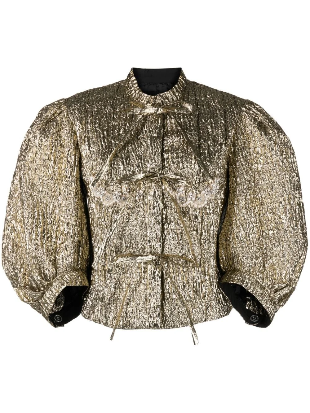 bow-detail puff-sleeve jacket Simone Rocha's affinity for whimsical designs adorned with pearlescent detailing takes centre stage for AW23, as evidenced by this gold-tone metallic jacket. Framed by long puff sleeves, the cropped design is artfully decorated floral appliques and faux-pearls. Highlights - Gold-tone - Metallic finish - Bow detailing - Floral applique - High neck - Long puff sleeves - Concealed front fastening - Cropped - Straight hem Imported Composition Polyamide 54%, Polyester 46% SIZE & FIT Model measurements Height 5 ft 10 in(1.77 m) Bust/Chest 28.74 in(73 cm) Hips 35.82 in(91 cm) Waist 24.4 in(62 cm) FittingInformation Designed to be unstructured, offering a loose fit throughout Made from a lightweight non-stretch fabric This piece fits true to size – take your usual size Washing instructions Dry Clean Only