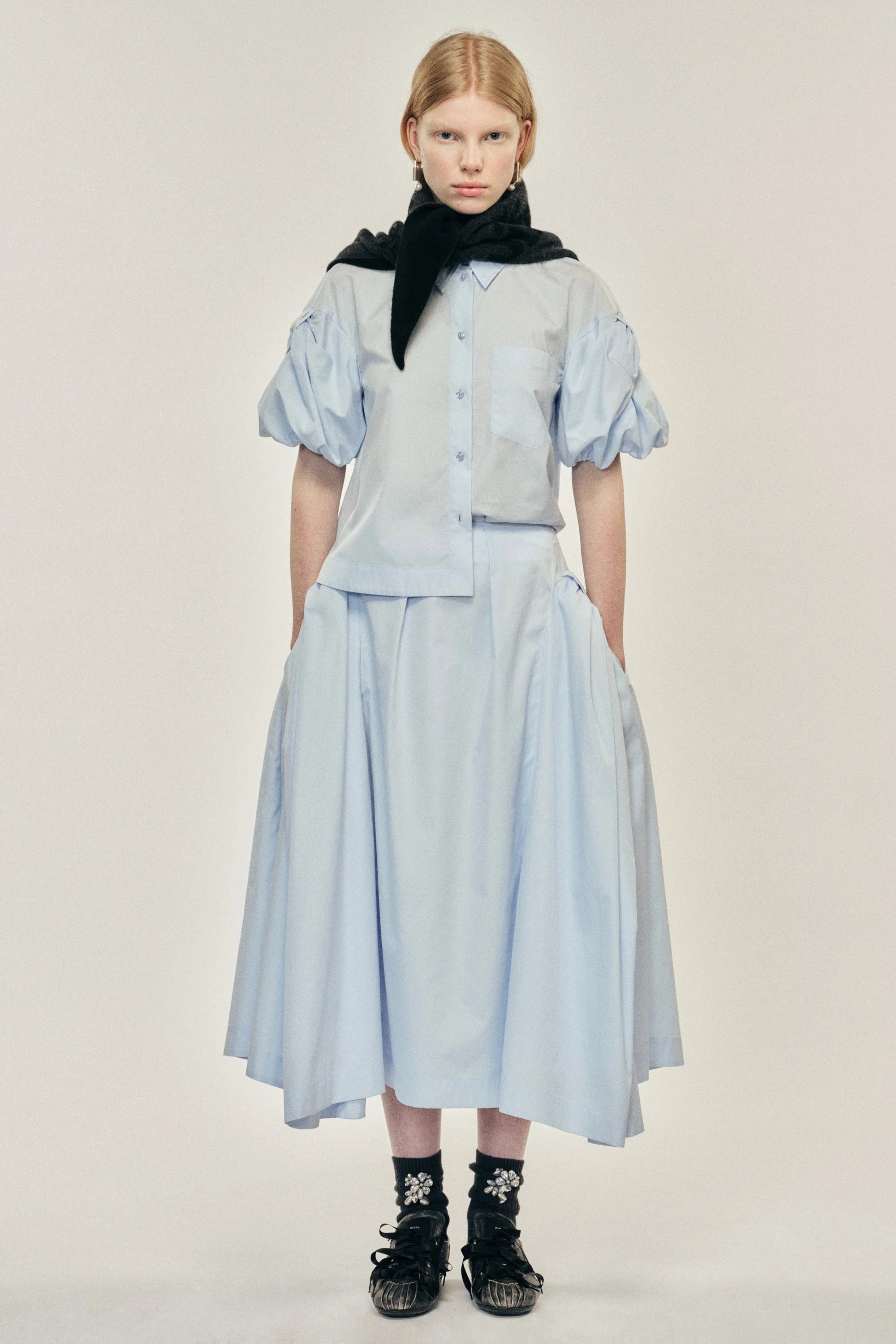 A voluminous cotton poplin skirt with an exaggerated hip detail featuring bows at the side. It pairs perfectly with the Cropped Bow Puff Sleeve Shirt. Product Details Cotton poplin midi skirt - Exaggerated hip detail - Bow accent at sides - Concealed pockets at side - Zip closure Composition: 100% Cotton Trim: 100% Nylon Lining: 100% Cotton SKU: 3163 1025 BABY BLUE Size & Fit Model is wearing size 6.