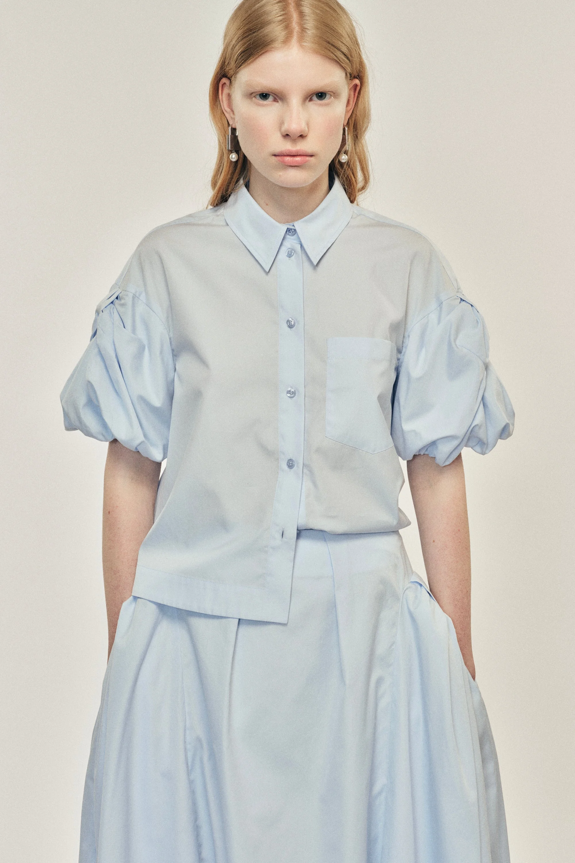 The signature Simone Rocha cropped puff sleeve shirt is updated with a gathered bow detail. It can be worn with a pair of high waisted trousers or skirt. The model is wearing this style with the Bow Hip Skirt. Product Details Cotton poplin button-up shirt - Bow accent at sleeve - Signature puff sleeve - Front button closure - Cropped hem Composition: 100% Cotton SKU: 5376 1025 BABY BLUE Size & Fit Model is wearing size 6.