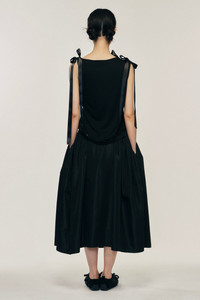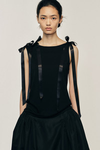 The Bow Ribbon Tail Tank features bow ribbons at the shoulder for a feminine touch, it is designed with a draped loose fit. The model is wearing this style with the Hip Detail Bind Skirt . Product Details Fine jersey tank top - Satin bow detail at shoulder - Shoulder cut out detail - Relaxed fit Composition: Self: 100% Lyocell Trim: 100% Polyester SKU: 5366 0571 BLACK Size & Fit Model is wearing size Extra Small.