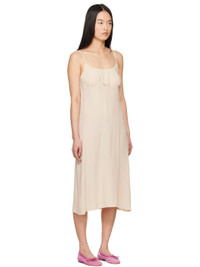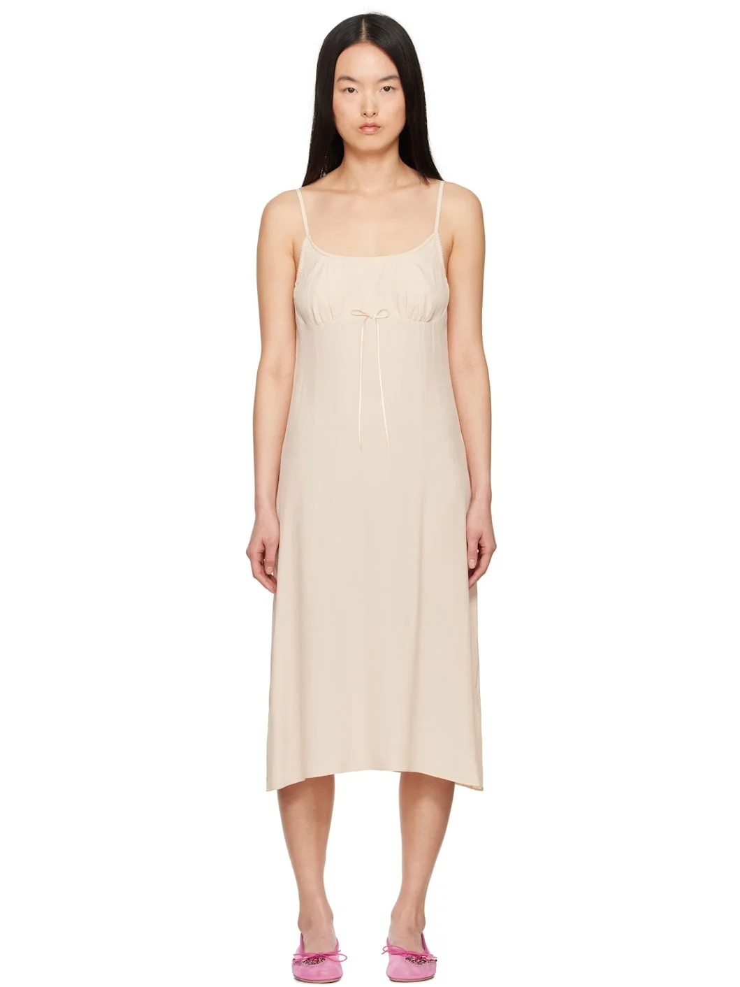 Acetate- and silk-blend crepe de chine slip-style midi dress. · Scalloped trim at elasticized scoop neck · Bow accent at chest · Gathering at cups · Adjustable spaghetti straps · Unlined Supplier color: Beige 73% acetate, 27% silk. Made in Portugal 251405F054012