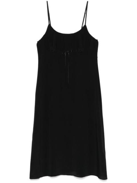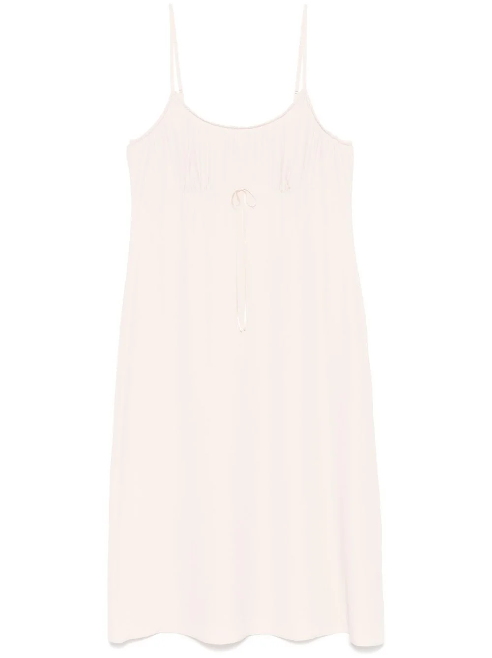 bow slip midi dress Highlights - Light beige - Adjustable spaghetti straps - Gathered detailing - Scallop edge Imported Composition Polyester 100%, Acetate 73%, Silk 27% SIZE & FIT Model measurements Height 5 ft 10 in(1.78 m) Bust/Chest 33.46 in(85 cm) Hips 36.22 in(92 cm) Waist 23.22 in(59 cm) FittingInformation Designed for a slim fit that sits just away from the body offering a close yet comfortable fit The adjustable shoulder straps allow for a preferred fit when worn Made from a lightweight non-stretch fabric