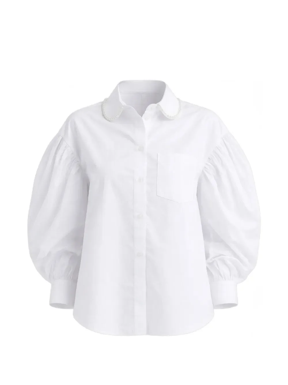 Boxy Draped Sleeve Round Collar Shirt with Embroidery in White/Pearl from Simone Rocha Highlights - white - round collar with pearl - front button closure - puffy sleeves - curved hem Made In Portugal Designer ID: 5405B 1287 Materials 100% Cotton