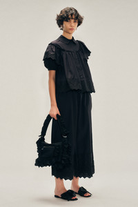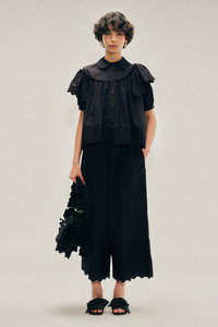 This cropped shirt features signature puffed sleeves and a Peter Pan collar. Broderie anglaise frilled panels trace the bust and hem with a delicate flourish. Product Details Cotton poplin button-up shirt - Frill detail throughout - Signature puff sleeve - Front button closure - Cropped hem Composition: SELF: 100% CO TRIM:BASE: 100% CO THREAD: 100%PL SKU: 5412T 1287 BLACK