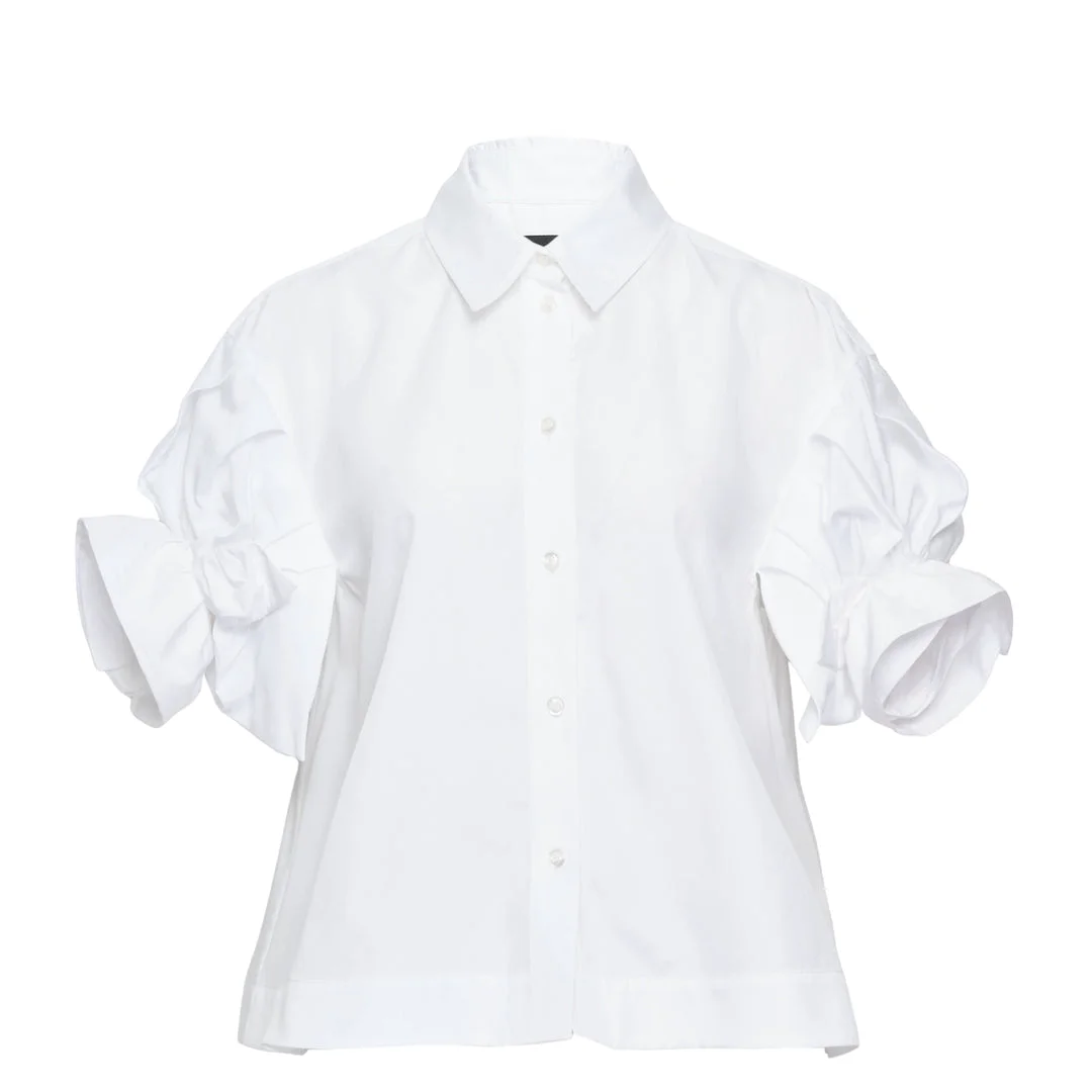 600081511WHT004 / 5460 1287/00/WHITE - Classic point collar - Dramatic puff sleeves with gathered volume - Button-front closure - Cropped length - Crisp cotton poplin construction - Structured fit through body - French seam finishing The Simone Rocha Cropped Rose Puff Sleeve Shirt delivers romantic femininity with contemporary tailoring and signature voluminous sleeves. Crafted from crisp white cotton poplin with structured puff sleeves that create dramatic silhouette and movement. The cropped proportion and classic collar styling embody the brand's distinctive blend of innocence and sophistication.